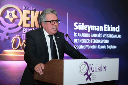 İÇASİFED Yönetim Kurulu Başkanı Süleyman Ekinci, üye derneklerimizden KAİSDER tarafından düzenlenen 9. EKD Ödül Töreni'ne katılım sağladı. Ödül töreninde açılış konuşmasını gerçekleştiren Başkan Süleyman Ekinci, sanayide kadın istihdamı konusunda eşitliğe önem veren firmaların olmasından büyük memnuniyet duyduklarını ve gerek iş hayatında gerek sosyal hayatta kadınların varlıklarının çok kıymetli olduğunu dile getirdi.